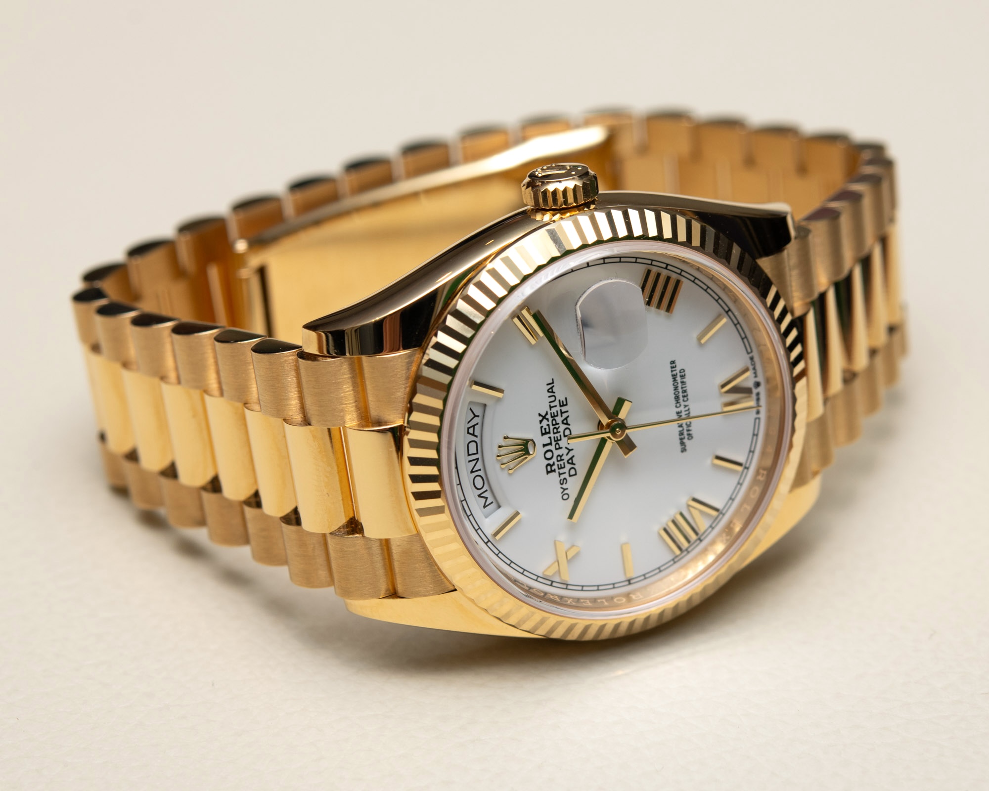Revenons à ce cadran. Les index appliqués sont agréables parce qu’ils donnent de la profondeur et une complexité distinctive à n’importe quel cadran. Le cadran de base de cette replique de Rolex Day-Date 36 avec chiffres romains est aussi simple que possible : un blanc laqué, avec une voie ferrée de base pour l’échelle des minutes autour de sa périphérie. Malgré sa quête perpétuelle d’excellence, Rolex a une longue tradition de lutte pour la lisibilité : La Day-Date 40 présentait des combinaisons de cadrans et d’aiguilles absolument terribles qui étaient illisibles pendant une grande partie du temps, tandis que toutes les Cellini modernes à cadran noir étaient illisibles tout le temps. Cette Day-Date 36 ne présente aucun de ces problèmes : les aiguilles et les index facettés (tous fabriqués en or jaune 18 carats massif) se détachent de leur arrière-plan brillant, même sous la plus faible lumière.